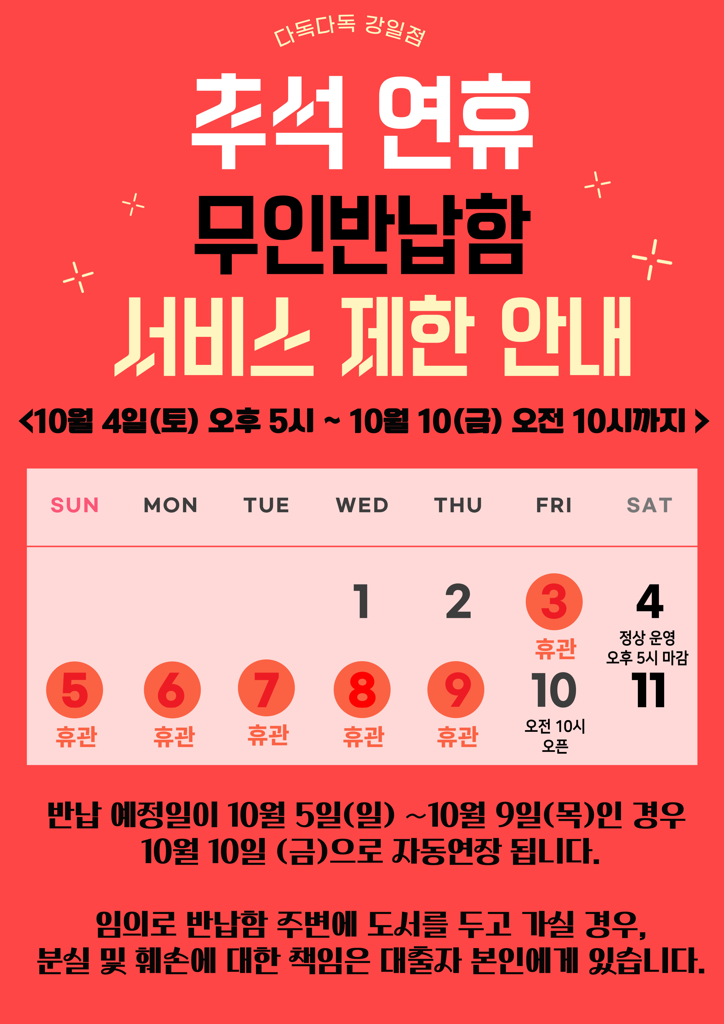 강일점 추석 연휴 휴관일 및 반납함 운영 중지 안내