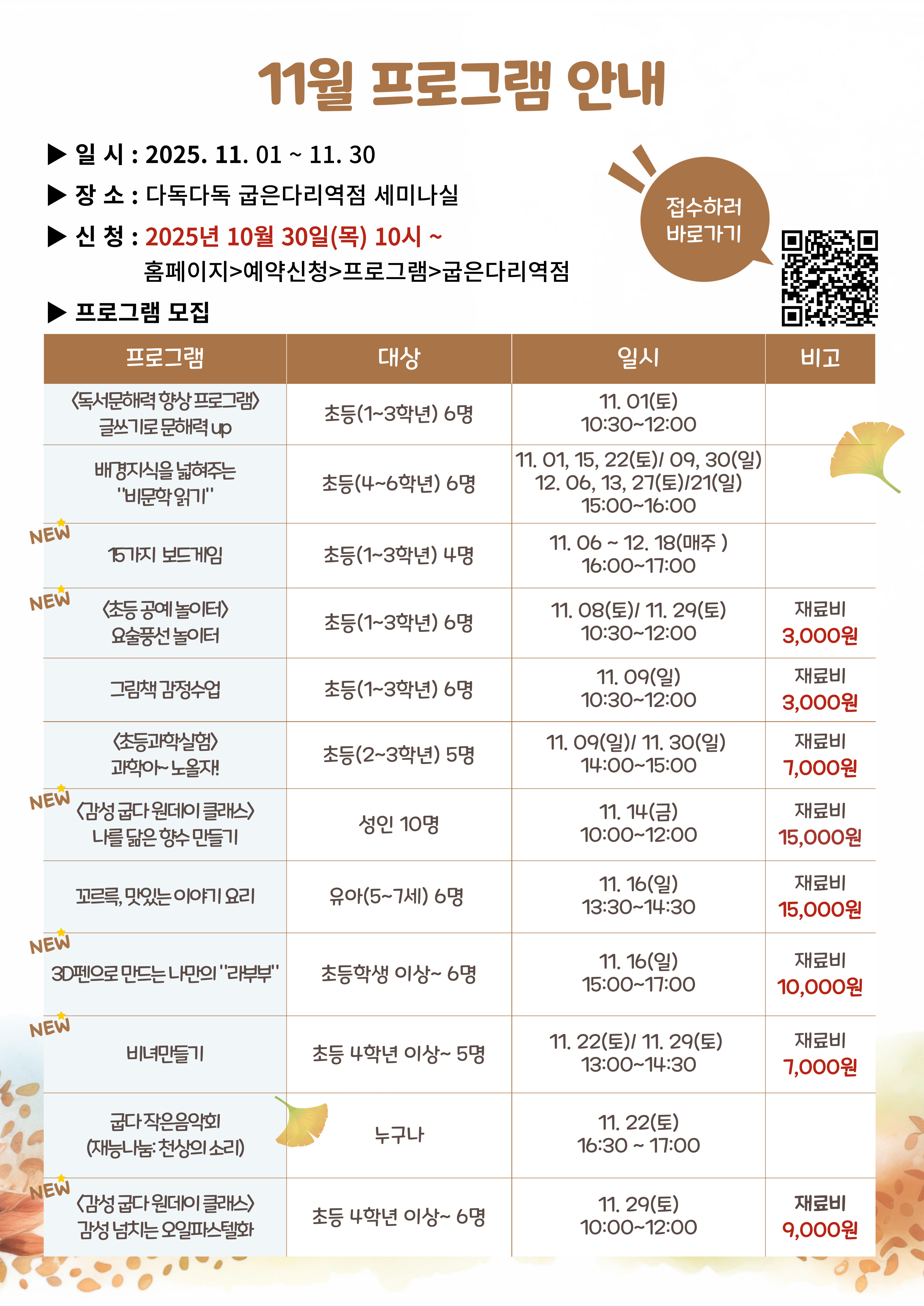 1. 홈페이지 “메뉴>예약신청>프로그램>굽은다리역점(선택)>프로그램 선택>접수하기“로 신청 하실 수 있습니다.