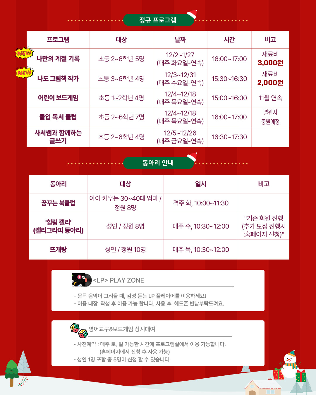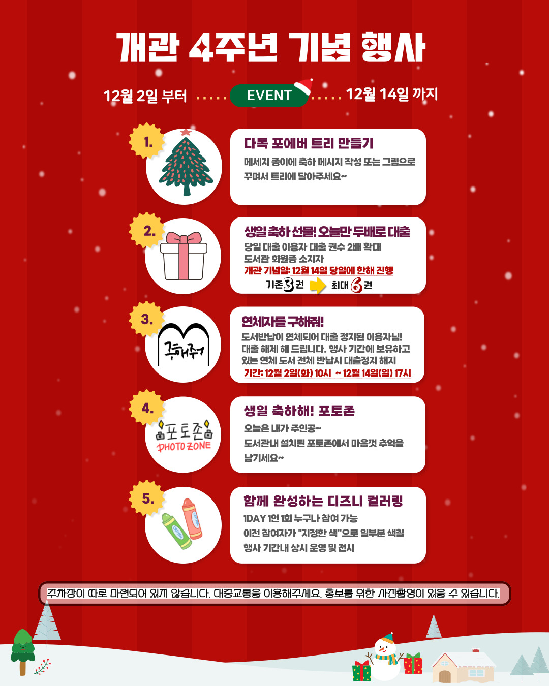 ⭐개관 4주년 기념 행사가 12월 2일부터 12월 14일까지 진행 될 예정입니다. 많은 관심과 참여 바랍니다.⭐