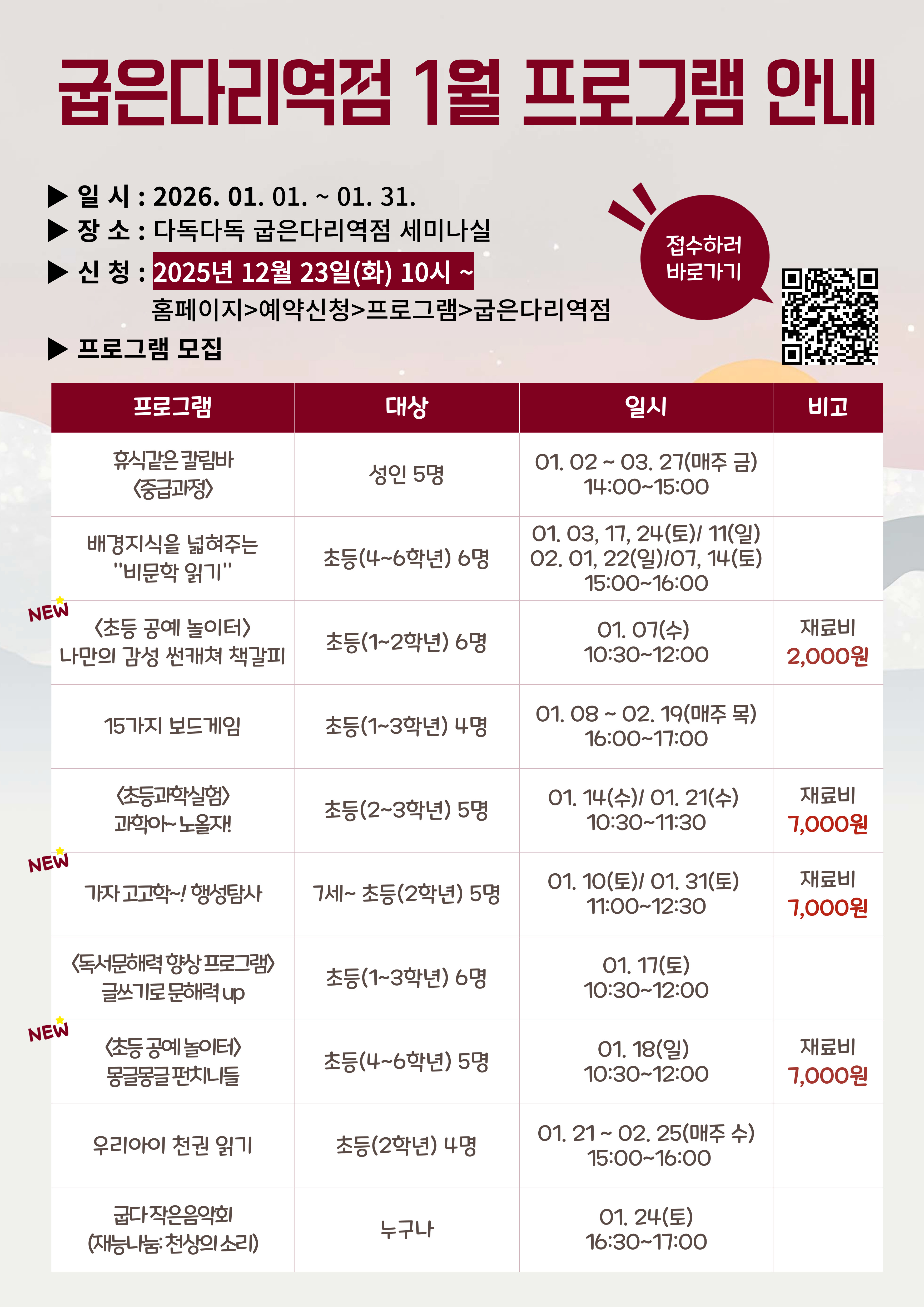 1. 홈페이지 “메뉴>예약신청>프로그램>굽은다리역점(선택)>프로그램 선택>접수하기“로 신청 하실 수 있습니다.