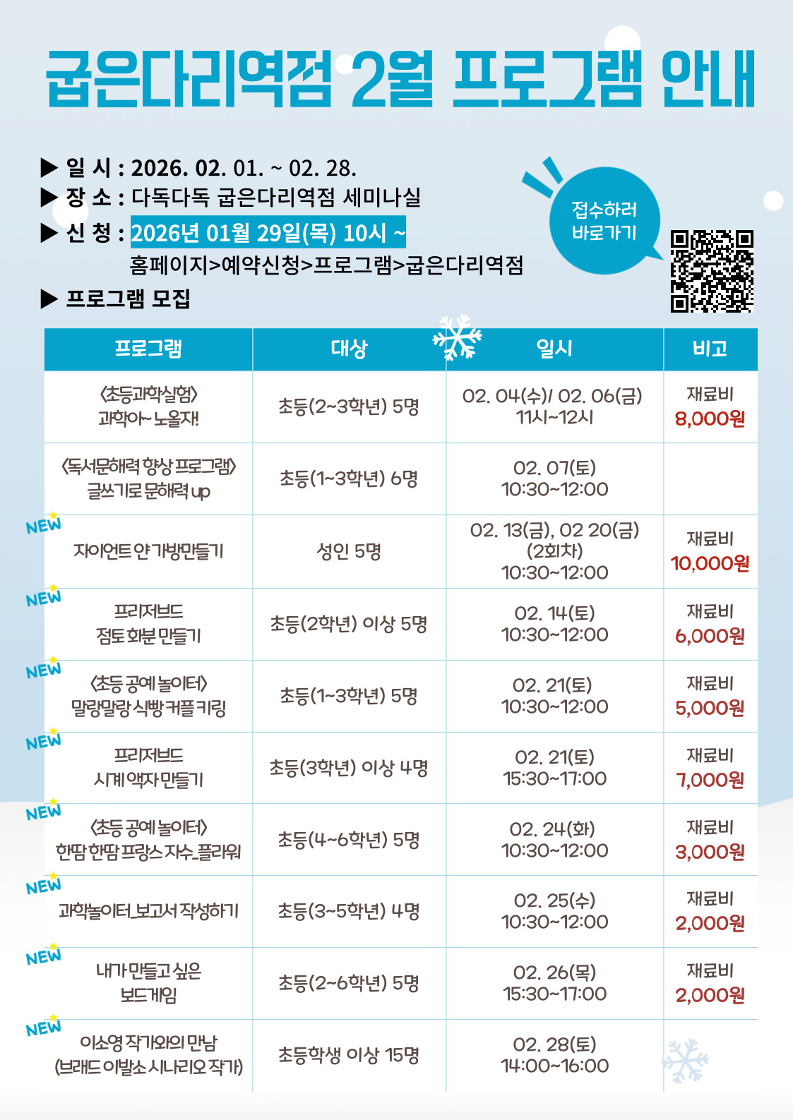 1. 홈페이지 “메뉴>예약신청>프로그램>굽은다리역점(선택)>프로그램 선택>접수하기“로 신청 하실 수 있습니다.