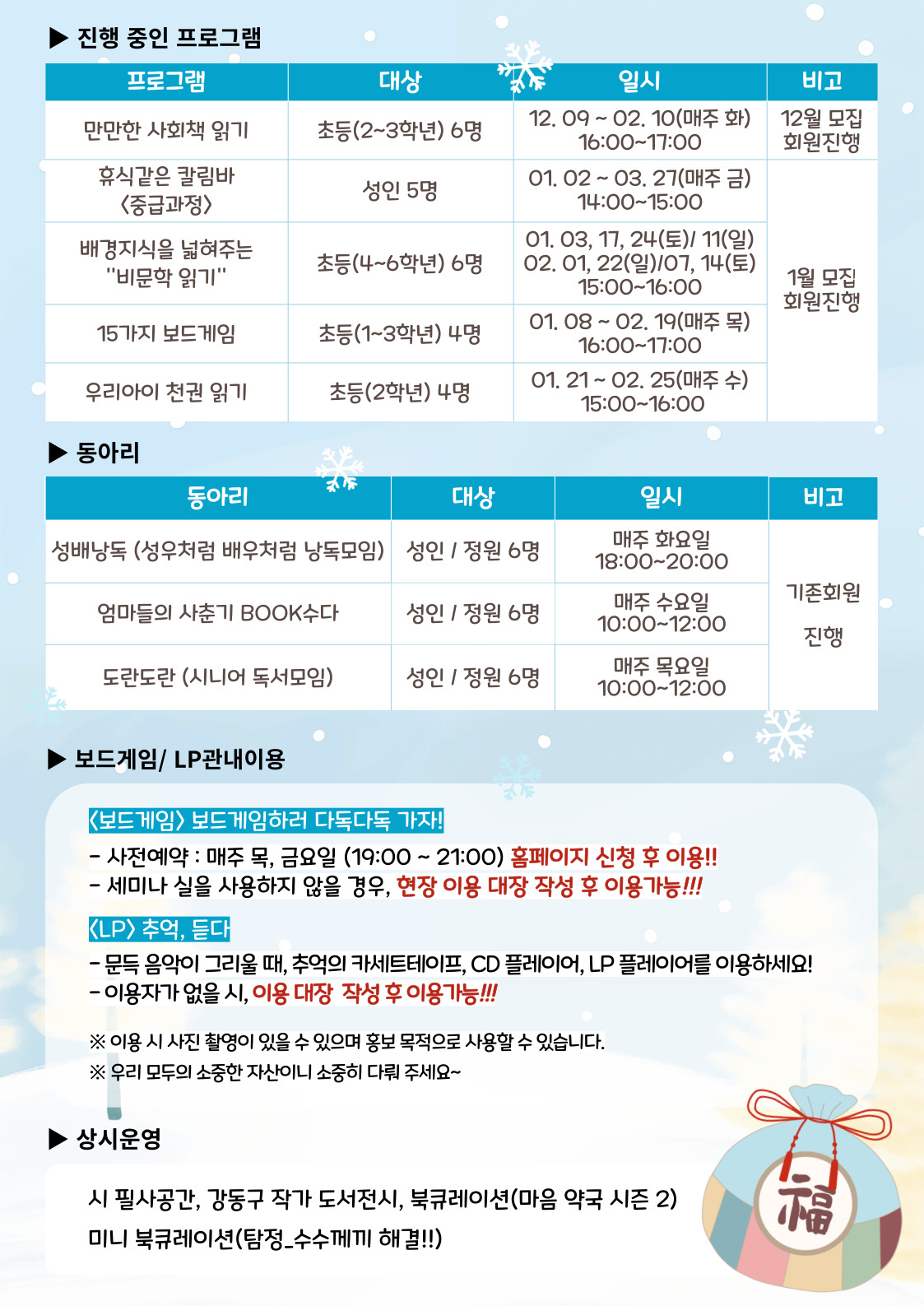 프로그램의 신청과 접수에 이용자분들의 배려 부탁드립니다.