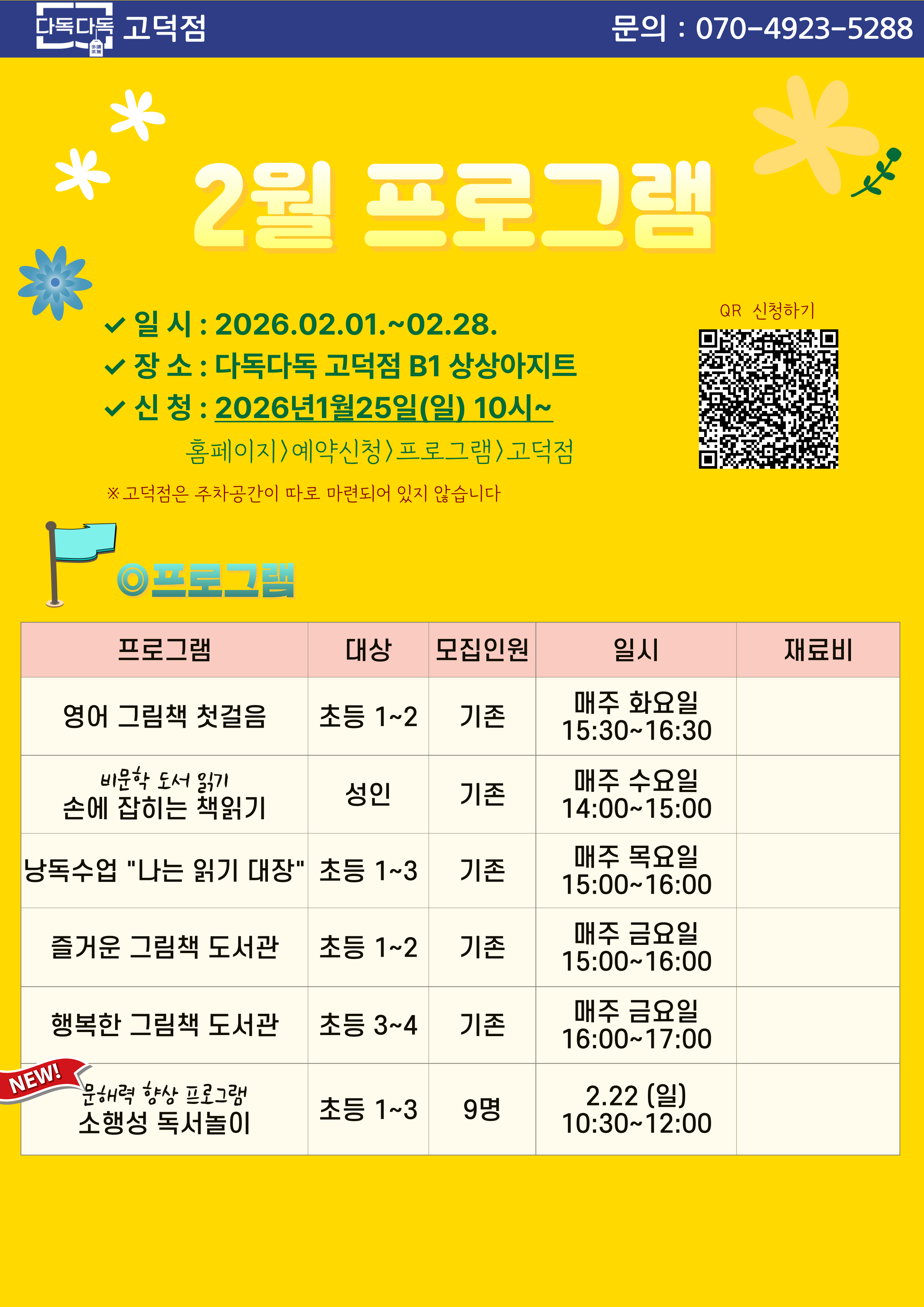 '예약신청▶프로그램▶고덕점(선택)▶검색▶신청할 프로그램 선택▶접수하기'로 하실 수 있습니다.