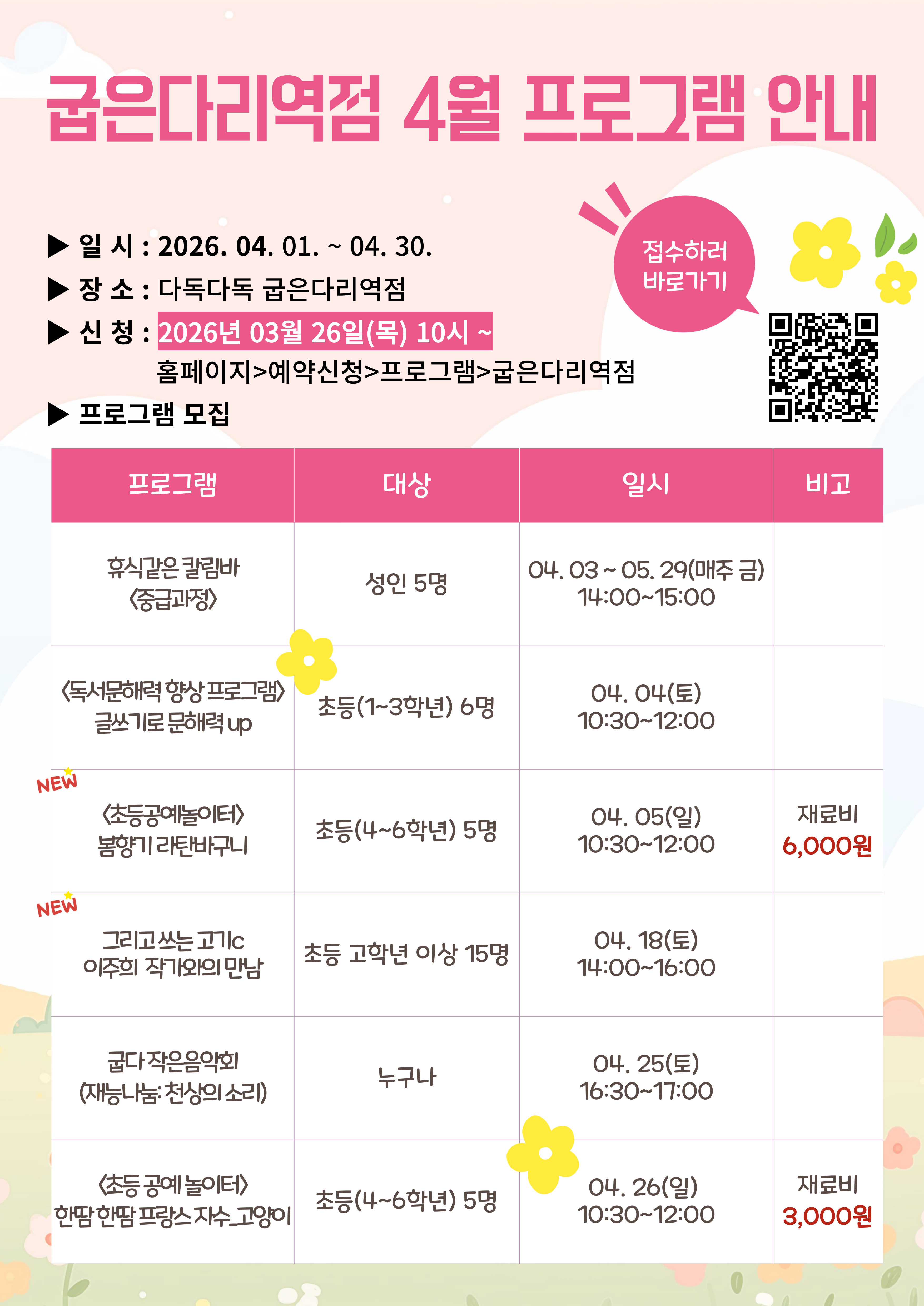 1. 홈페이지 “메뉴>예약신청>프로그램>굽은다리역점(선택)>프로그램 선택>접수하기“로 신청 하실 수 있습니다.