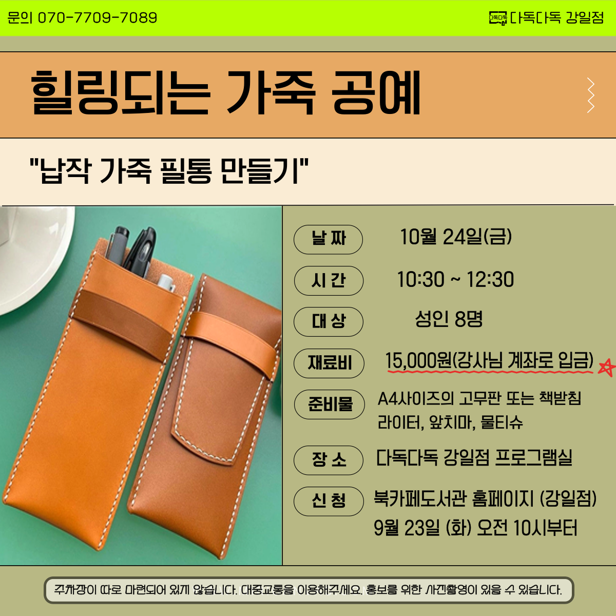 재료비를 강사님께 직접 입금 후 다독다독 강일점으로 전화 or 문자 연락 부탁드립니다.