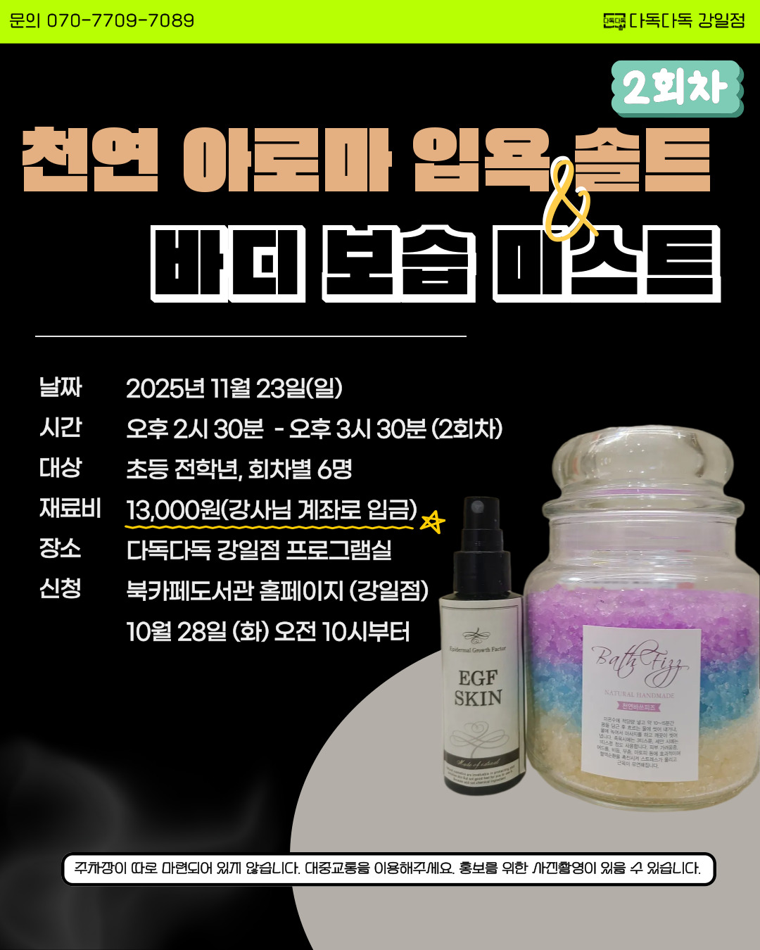 #다독다독강일점 #강동구립도서관 #강동구북카페도서관 #강동구 #강일동 #책 #독서 #도서관 #도서관프로그램#원데이클래스#천연아로마입욕솔트#바디보습미스트