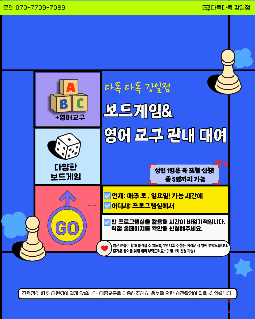 성인 1분👨‍🦱이 대표로 신청해주시고 시간🕛에 맞춰 교구나 게임을 함께 할 아이들👨‍👨‍👧‍👧(최고 5명) 과 함께 도서관으로 와주시면 됩니다!