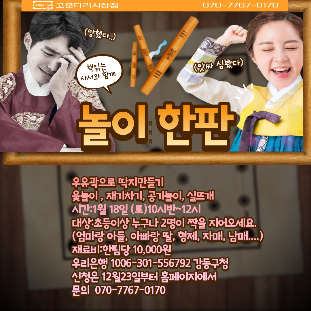 놀이는 혼자하면 재미 없어요. 함께 할 부모님이나 형제 자매 누구든 2명씩 짝을 지어 오세요. 가족과 함께 하는 놀이를 배워서 명절을 즐겨요.