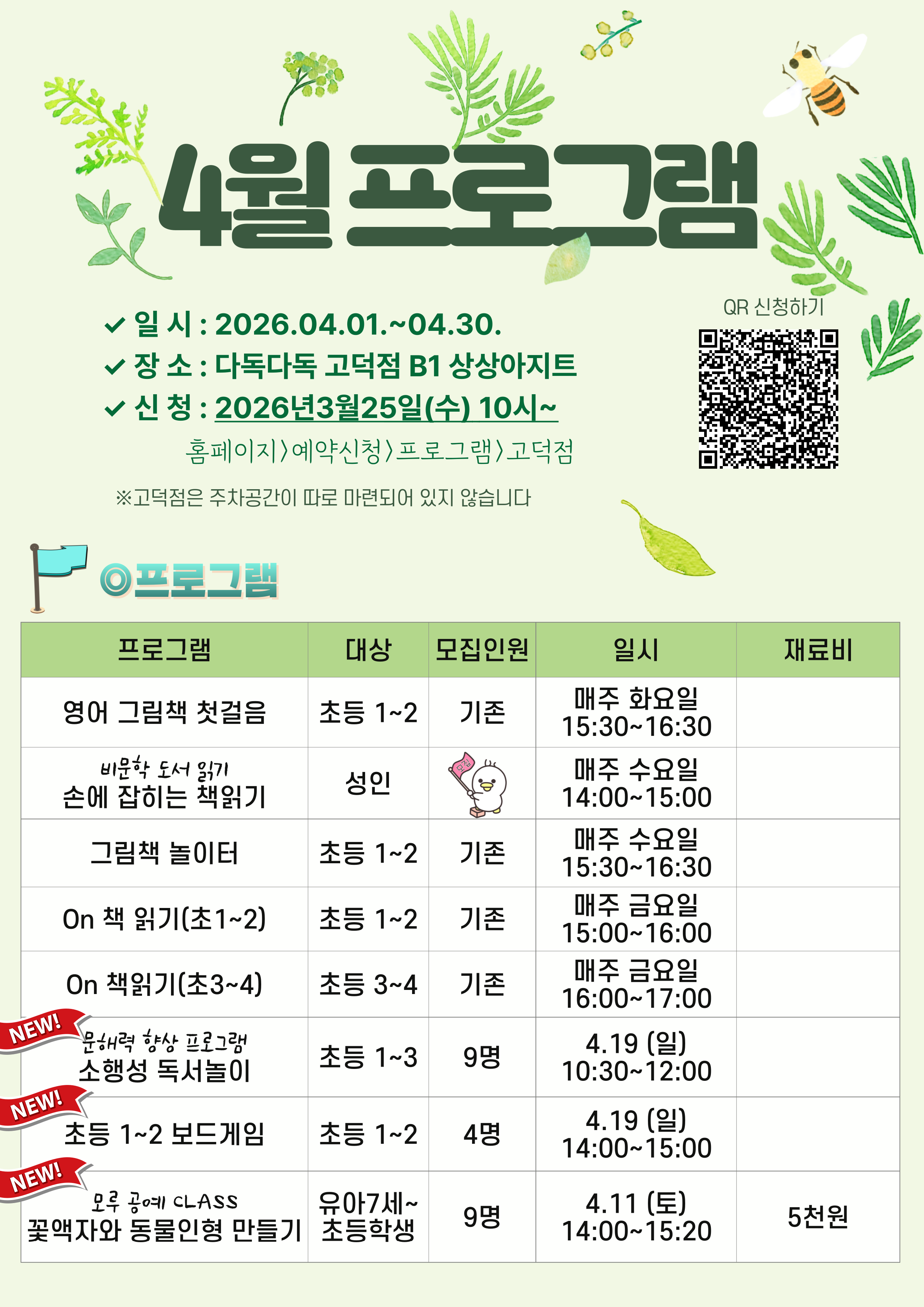 '예약신청▶프로그램▶고덕점(선택)▶검색▶신청할 프로그램 선택▶접수하기'로 하실 수 있습니다.